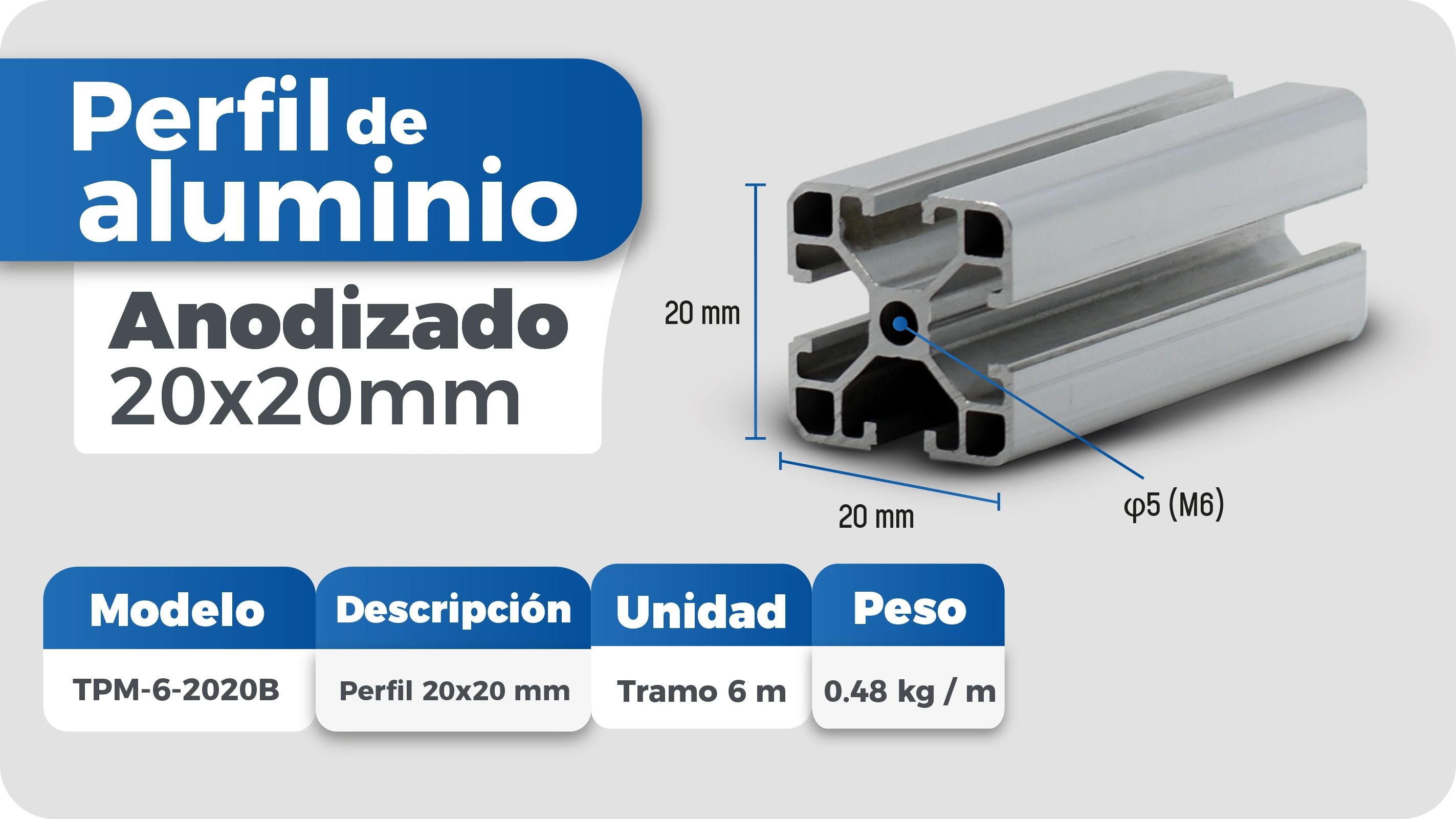 Perfil de aluminio 20x20mm